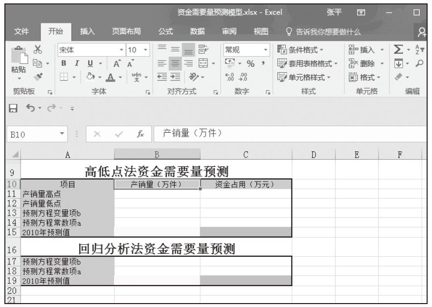 步骤02:创建如图16-2所示的高低点资金预测模型和回归分析法资金预测模型。