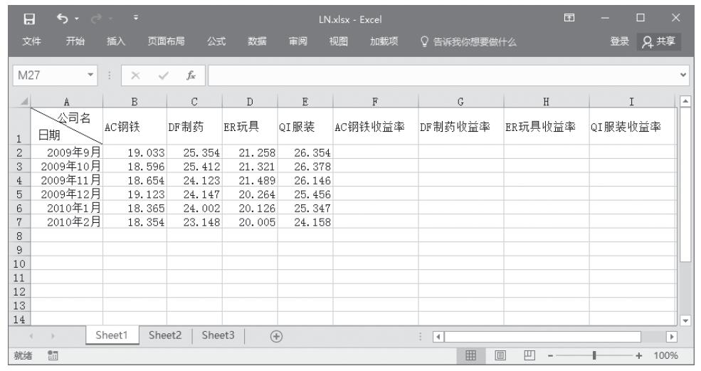 【典型案例】已知有4家上市企业,分别是AC钢铁、DF制药、ER玩具和QI服装,从2007年9月到2008年2月的股票指数数据,投资分析人员需要计算股票的月收益率,以连续复利计,原始的指数数据如图13-28所示。