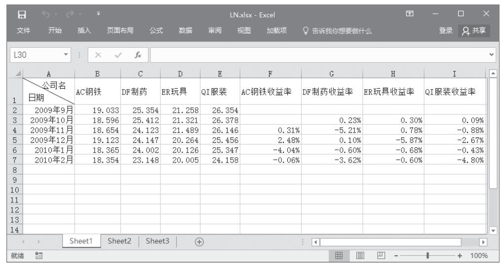在F3单元格中输入公式“=LN(B3/B2)”,计算AC钢铁企业在2007年10月份的股票收益率,然后使用纵向自动填充功能来计算其他日期的收益率,使用横向自动填充功能来计算其他企业的收益率,结果如图13-29所示。