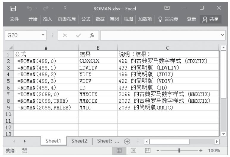 ROMAN函数的功能是将阿拉伯数字转换为文本形式的罗马数字。其语法如下: