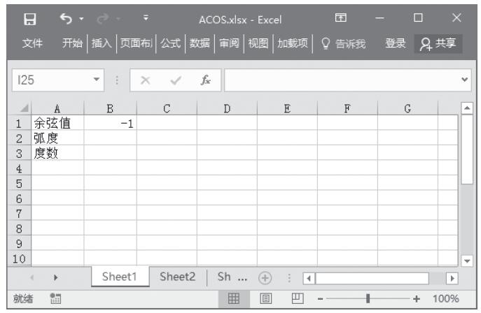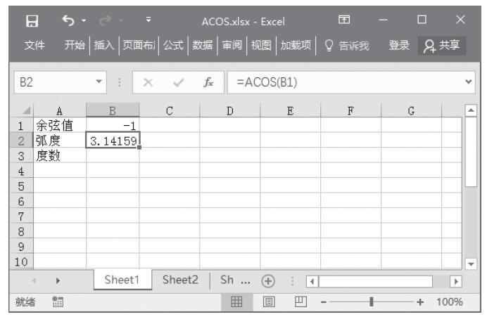 步骤1:在B2单元格输入公式“=ACOS(B1)”,求出余弦值为-1的角度的弧度数,结果如图13-94所示。