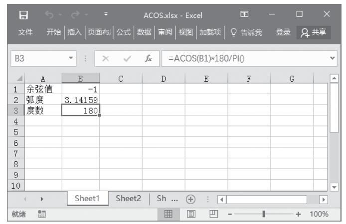 步骤2:在B3单元格输入公式“=ACOS(B1)*180/PI()”,求出余弦值为-1的角度的度数,结果如图13-95所示。