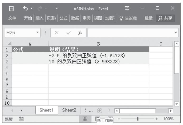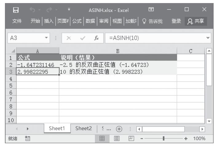 Excel 应用ASINH函数计算数字的反双曲正弦值