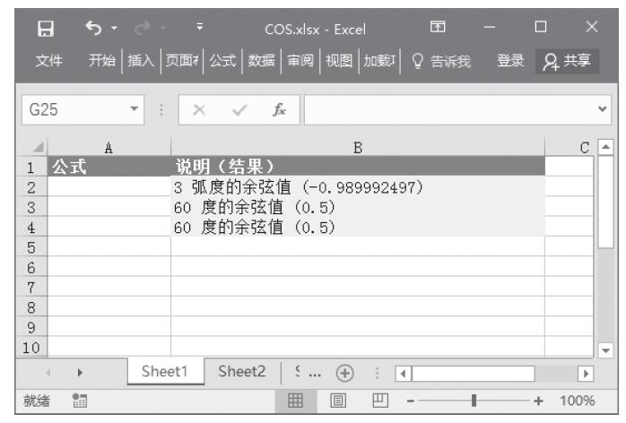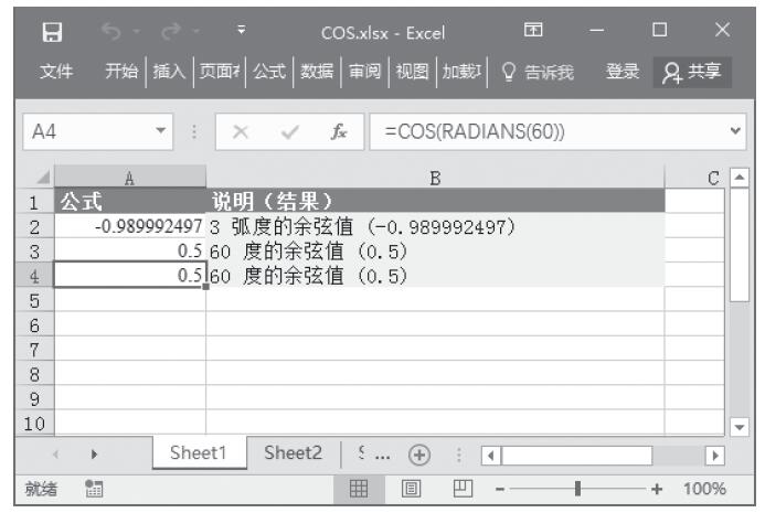 步骤3:在A4单元格中输入公式“=COS(RADIANS(60))”,计算60度的余弦值,计算结果如图13-115所示。