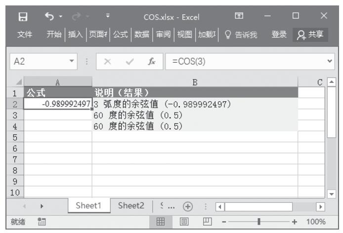 步骤1:在A2单元格中输入公式“=COS(3)”,计算3弧度的余弦值,计算结果如图13-113所示。