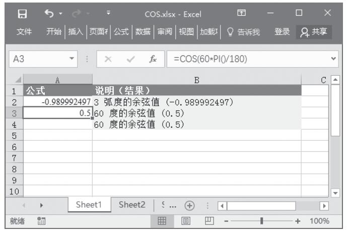 步骤2:在A3单元格中输入公式“=COS(60*PI()/180)”,计算60度的余弦值,计算结果如图13-114所示。