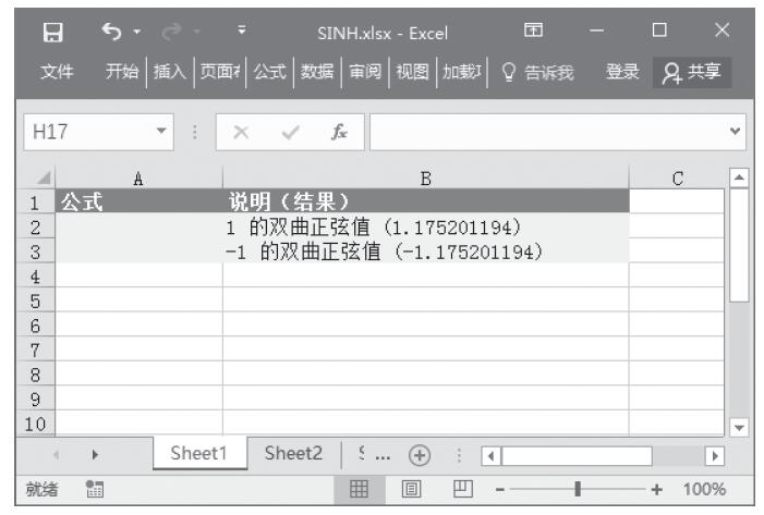 Excel 应用SINH函数计算某数字的双曲正弦值