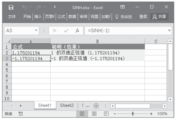 步骤2:在A3单元格中输入公式“=SINH(-1)”,计算数值-1的双曲正弦值,计算结果如图13-127所示。