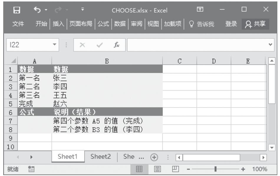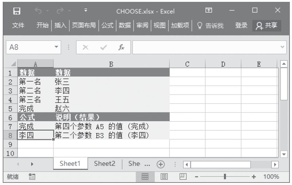 步骤2:在A8单元格中输入公式“=CHOOSE(2,B2,B3,B4,B5)”,用于返回第二个参数B3的值(李四)。计算结果如图15-6所示。