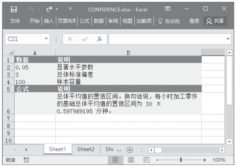 【典型案例】假设样本取自100名某生产车间的工人,他们平均每小时加工的零件数量为20个,总体标准偏差为3个。假设alpha=0.05,计算CONFIDENCE(.05,3,100)的返回值为0.692952。那么,相应的置信区间为20±0.692952≈[19.3,20.7]。对于包含在本区间中的任何总体平均值μ0,从μ0到30,获取样本平均值的概率大于0.05。同样地,对于未包含在本区间中的任何总体平均值μ0,从μ0到30,获取样本平均值的概率小于0.05。基础数据如图16-13所示。