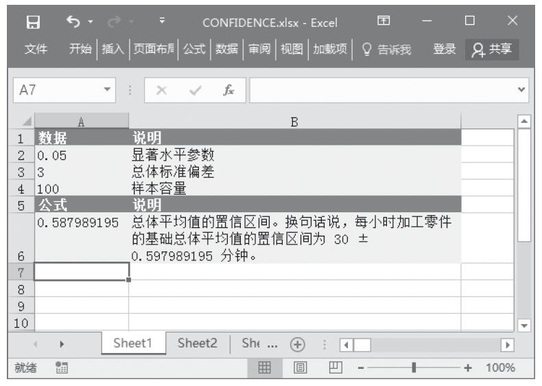 步骤2:在单元格A6中输入公式“=CONFIDENCE(.05,3,100)”,用于计算总体平均值的置信区间。计算结果如图16-14所示。