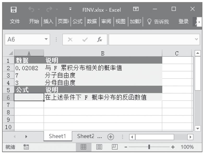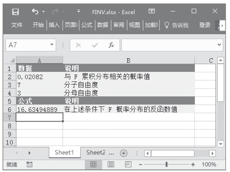 步骤2:在单元格A6中输入公式“=FINV(A2,A3,A4)”,用于计算F概率分布的反函数值。计算结果如图16-34所示。