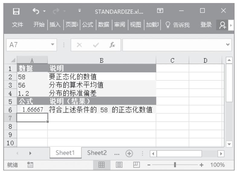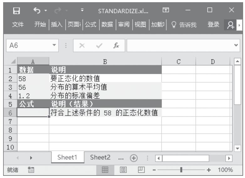 步骤2:在单元格A6中输入公式“=STANDARDIZE(A2,A3,A4)”,用于计算符合上述条件的58的正态化数值。计算结果如图16-112所示。