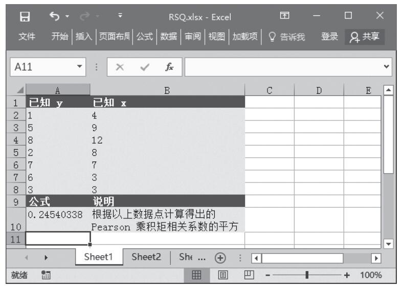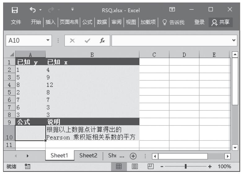 步骤2:在单元格A10中输入公式“=RSQ(A2:A8,B2:B8)”,用于根据以上数据点计算得出的Pearson乘积矩相关系数的平方。计算结果如图16-138所示。