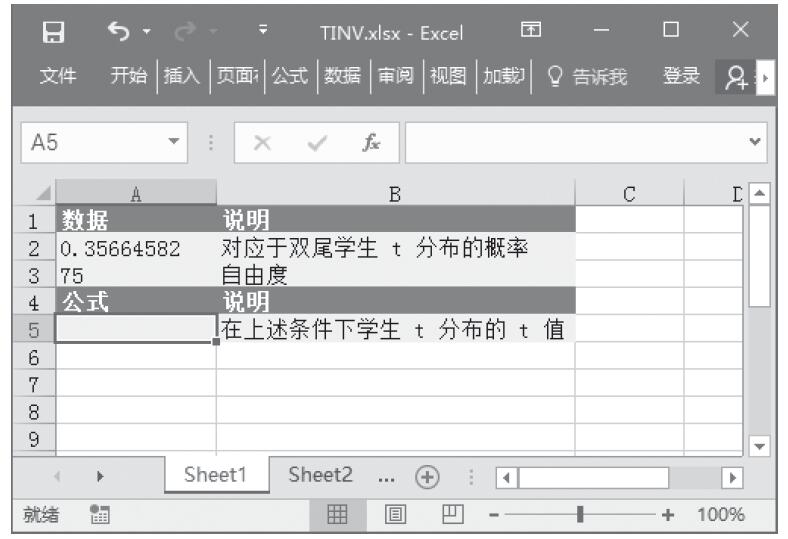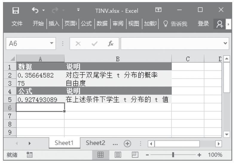 步骤2:在单元格A5中输入公式“=TINV(A2,A3)”,用于计算学生t分布的t值。计算结果如图16-142所示。