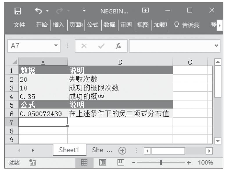步骤2:在单元格A6中输入公式“=NEGBINOMDIST(A2,A3,A4)”,用于计算在这些条件下的负二项式分布值。计算结果如图16-152所示。