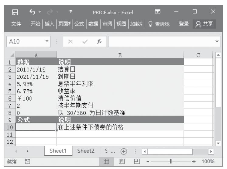 步骤2:在单元格A10中输入公式“=PRICE(A2,A3,A4,A5,A6,A7,A8)”,用于计算在上述条件下债券的价格。计算结果如图17-84所示。