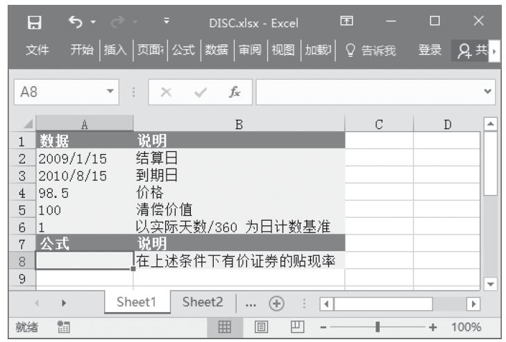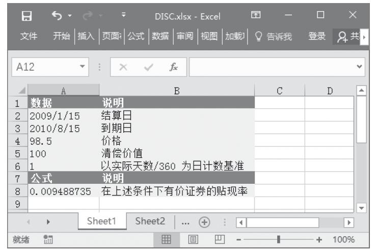 步骤2:在单元格A8中输入公式“=DISC(A2,A3,A4,A5,A6)”,用于计算在这些条件下有价证券的贴现率。计算结果如图17-90所示。