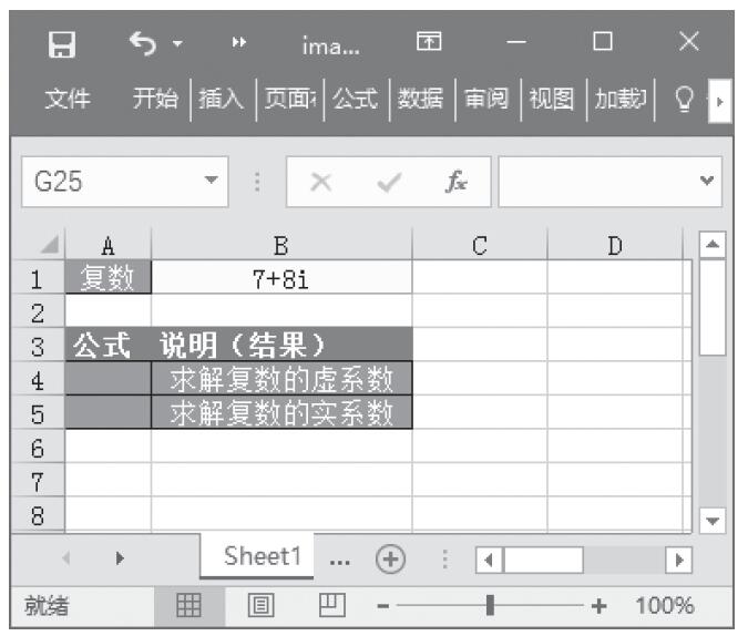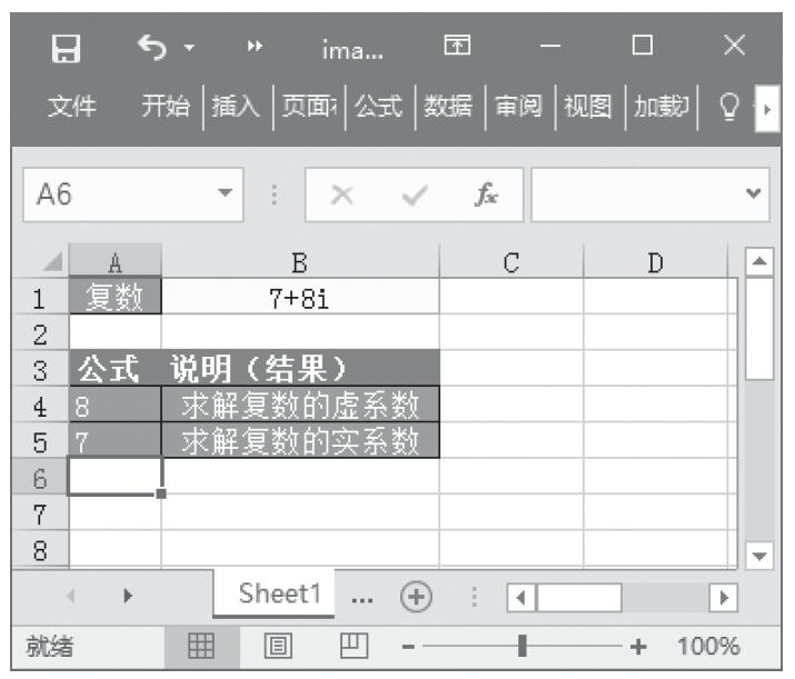 步骤1:在单元格A4中输入公式“=IMA-G-I-N-ARY(B1)”,用于求解复数的虚系数。