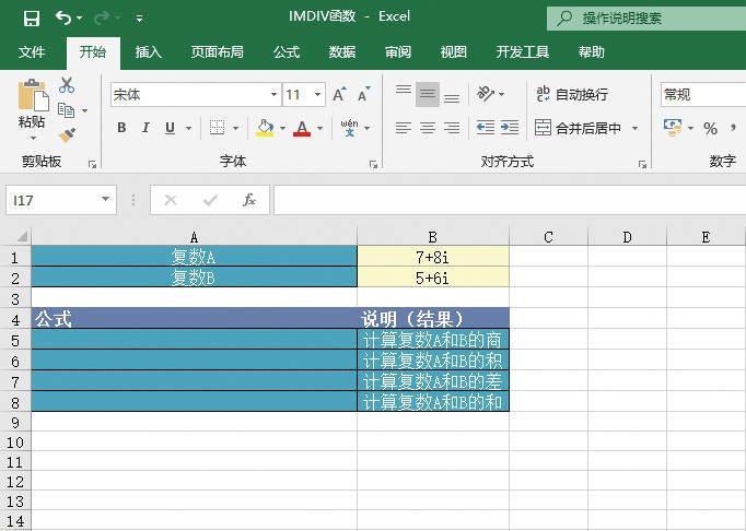 打开“IMDIV函数.xlsx”工作簿,切换至“Sheet1”工作表,本例的数据说明如图20-36所示。该工作表中记录了复数A和复数B两个数据,要求计算复数的商、积、差与和。具体的操作步骤如下。