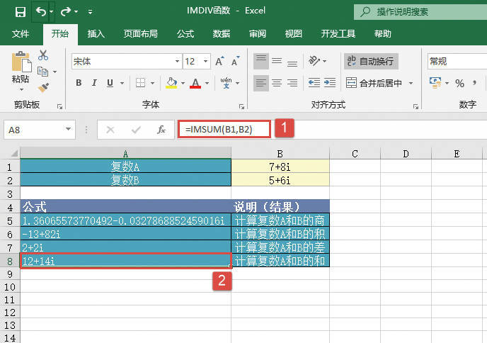 STEP04:选中A8单元格,在编辑栏中输入公式“=IMSUM(B1,B2)”,然后按“Enter”键返回,即可计算出复数A和B的和,结果如图20-40所示。