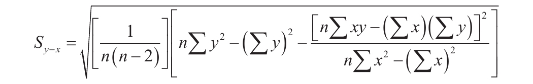 参数可以是数字或者包含数字的名称、数组或引用。逻辑值和直接键入参数列表中代表数字的文本被计算在内。如果数组或引用参数包含文本、逻辑值或空白单元格,则这些值将被忽略;但包含零值的单元格将计算在内。如果参数为错误值或为不能转换成数字的文本,将会导致错误。如果known_y’s和known_x’s的数据点个数不同,函数STEYX返回错误值“#N/A”。如果known_y’s和known_x’s为空或其数据点个数小于3,函数STEYX返回错误值“#DIV/0!”。预测值y的标准误差计算公式如下: