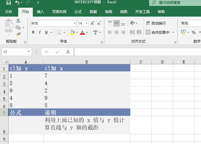 打开“INTERCEPT函数.xlsx”工作簿,切换至“Sheet1”工作表,本例中的原始数据如图18-70所示。该工作表中记录了一组x、y值,要求计算直线与y轴的截距。具体的操作步骤如下。