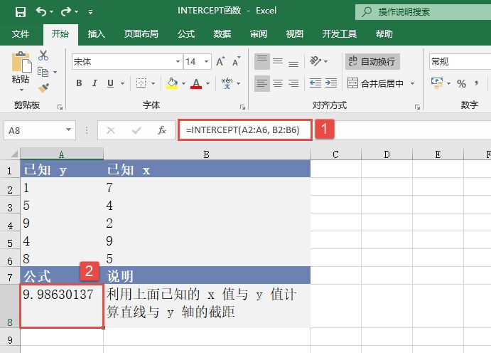 INTERCEPT函数用于利用现有的x值与y值计算直线与y轴的截距。截距为穿过已知的known_x’s和known_y’s数据点的线性回归线与y轴的交点。当自变量为0(零)时,使用INTERCEPT函数可以决定因变量的值。例如,当所有的数据点都是在室温或更高的温度下取得的,可以用INTERCEPT函数预测在0℃时金属的电阻。INTERCEPT函数的语法如下: