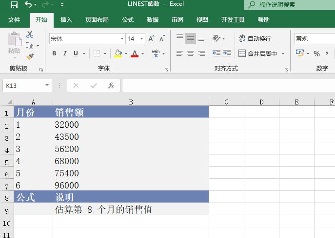 打开“LINEST函数.xlsx”工作簿,切换至“Sheet1”工作表,本例中的原始数据如图18-72所示。已知某公司1月~6月的产品销售额,要求估算第8个月的销售值。具体的操作步骤如下。