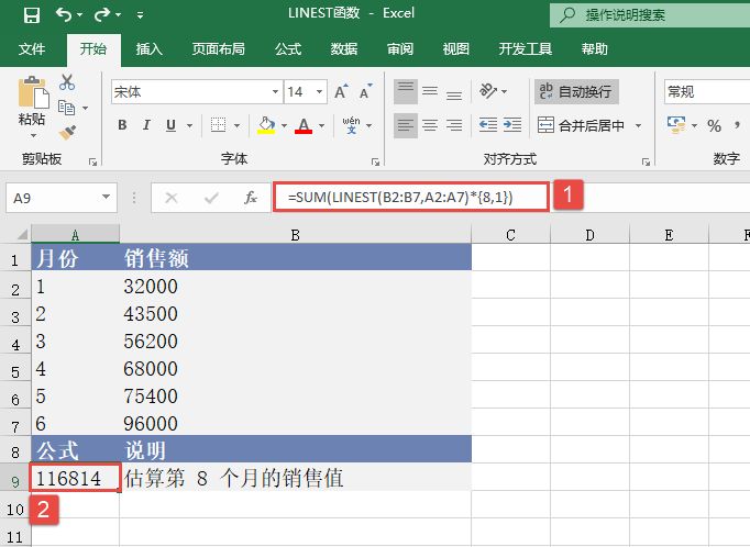 选中A9单元格,在编辑栏中输入公式“=SUM(LINEST(B2:B7,A2:A7)*{8,1})”,用于估算第8个月的销售值,输入完成后按“Enter”键返回计算结果,如图18-73所示。