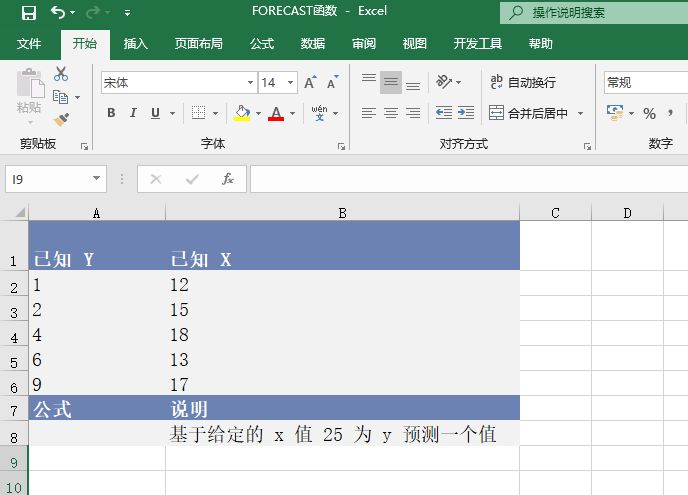 打开“FORECAST函数.xlsx”工作簿,切换至“Sheet1”工作表,本例中的原始数据如图18-74所示。该工作表中记录了一组给定的X和Y值,要求基于给定的X值25预测一个Y值。具体的操作步骤如下。