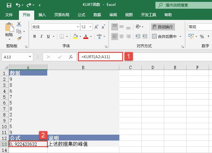 选中A13单元格,在编辑栏中输入公式“=KURT(A2:A11)”,用于计算给定数据集的峰值,输入完成后按“Enter”键返回计算结果,如图18-79所示。