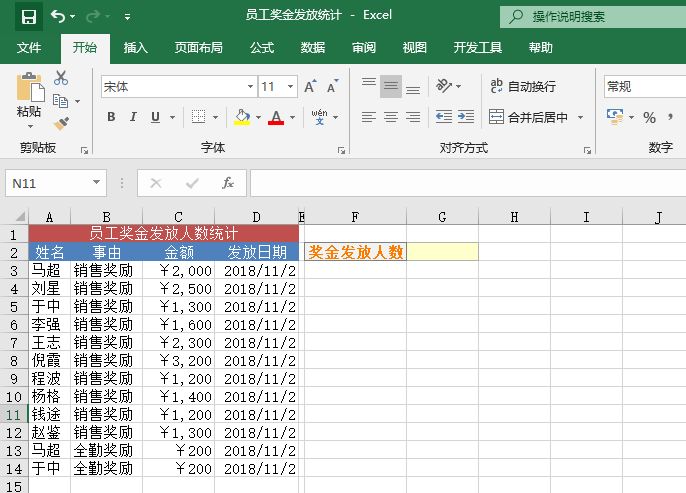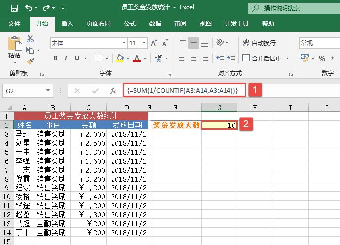 以上公式先利用COUNTIF函数返回单元格区域内某记录出现的次数的数组,取倒数,然后求和。如果姓名不重复出现,则得到1,如果重复出现2次,则得到1/2,求和之后仍然是1,这样可以实现不重复统计。经过以上操作,即实现了奖金发放人数的统计。