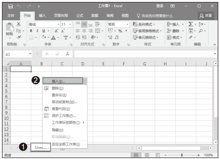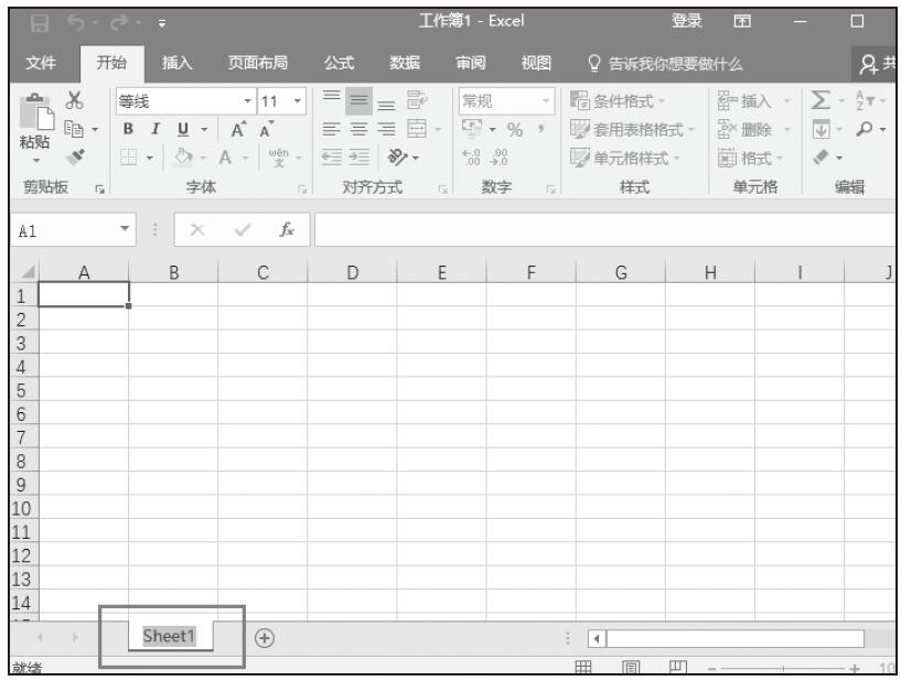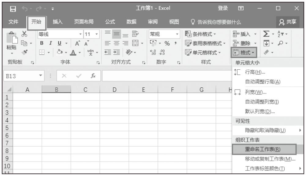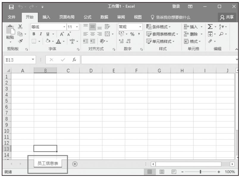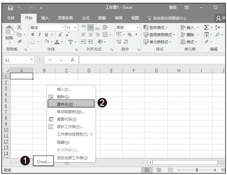 步骤01:打开第1章的实例文件“公司员工薪资应用案例.xlsx”,新建一个Excel工作簿,选择名为Sheet1的工作表,右键单击Sheet1工作表标签,单击弹出菜单中的“重命名”命令,如图1-9所示。将工作表重命名为“财务人员基本情况登记表”,如图1-10所示。
