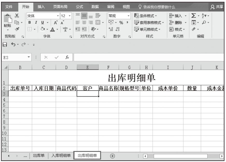 步骤01:打开“进销存管理.xlsx”工作簿,复制“入库明细单”工作表,将复制后的工作表重命名为“出库明细单”,并将其移到工作表的最后位置。然后将该工作表中的“入库”更改为“出库”,将“供应商”更改为“客户”,并删除“客户”列中的公式。接着将表中的两条入库记录删除,只删除不含有公式的单元格的内容,其余内容和单元格中的公式保持不变,效果如图5-88所示。