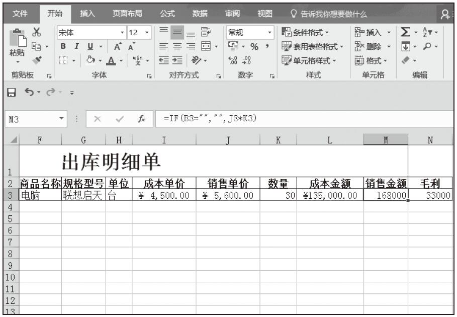 步骤04:在单元格J3中输入出库商品的销售单价,然后在单元格M3中输入公式“=IF(B3=””,””,J3*K3)”,在N3单元格中输入公式“=IF(B3=””,””,M3-L3)”,按Enter键完成公式输入,最终效果如图5-91所示。