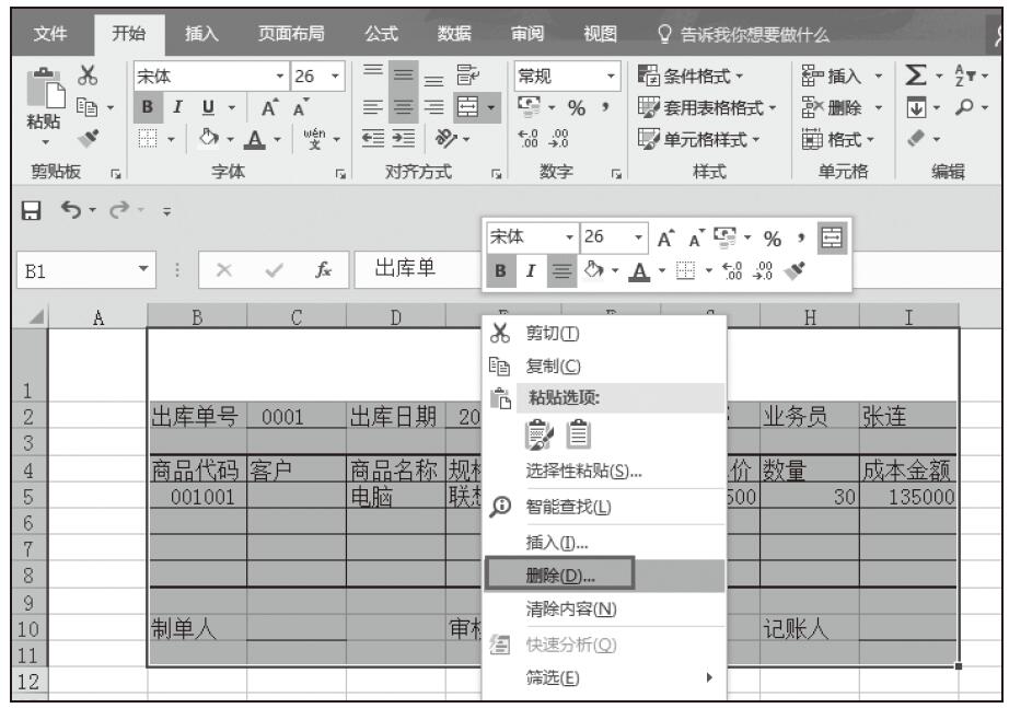 步骤01:打开“进销存管理.xlsx”工作簿,复制“出库单”工作表,将复制后的工作表重命名为“库存统计”,并将其移到工作表的最后位置。选中单元格区域“B1:I11”,然后单击鼠标右键,在弹出的快捷菜单中选择“删除”选项,如图5-92所示。