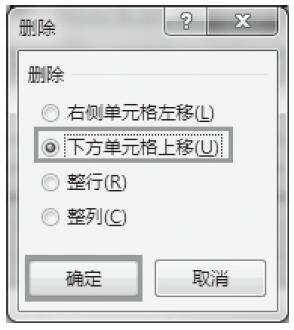 步骤02:弹出“删除”对话框,选中“下方单元格上移”单选按钮,然后单击“确定”按钮,如图5-93所示。