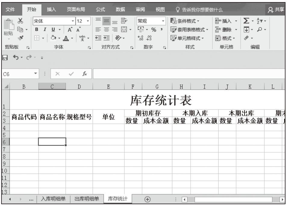 步骤04:在“库存统计”工作表中输入表格标题和相应的列标题,然后进行单元格格式设置,并适当地调整各列的列宽,如图5-95所示。