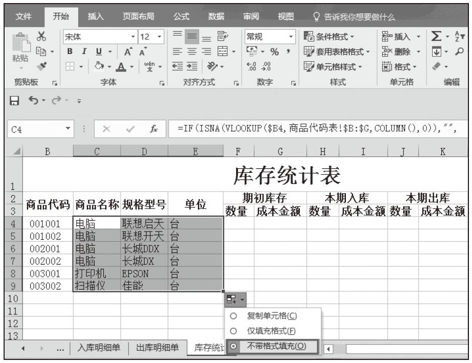 步骤05:在“商品代码”列输入文本型数值代码,然后在C4单元格中输入公式“=IF(ISNA(VLOOKUP($B4,商品代码表!$B:$G,COLUMN(),0)),””,VLOOKUP($B4,商品代码表!$B:$G,COLUMN(),0))”,按Enter键完成输入,随即返回引用结果。然后将该单元格的公式向右和向下填充(不带格式),如图5-96所示。