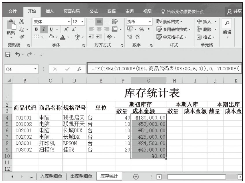 步骤06:在F4:F10单元格中输入期初库存数量,然后在单元格G4中输入公式“=IF(ISNA(VLOOKUP($B4,商品代码表!$B:$G,6,0)),0,VLOOKUP($B4,商品代码表!$B:$G,6,0)*F4)”,按Enter键完成输入,随即返回计算结果。然后将该单元格的公式填充到该列的其他单元格中,如图5-97所示。