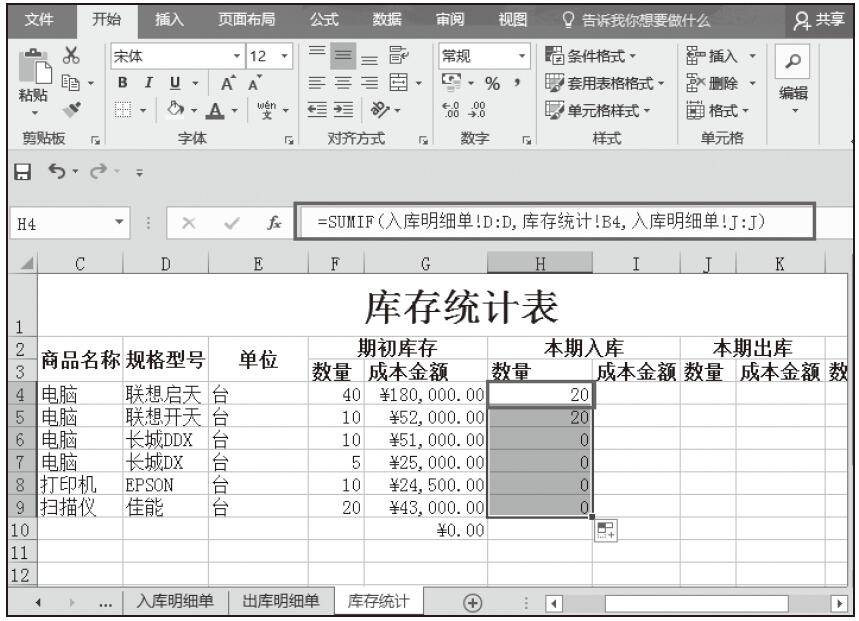 步骤07:导入本期商品入库的数量。在单元格H4中输入公式“=SUMIF(入库明细单!D:D,库存统计!B4,入库明细单!J:J)”,按Enter键完成输入,随即返回计算结果。然后将该单元格的公式填充到该列其他单元格中,如图5-98所示。