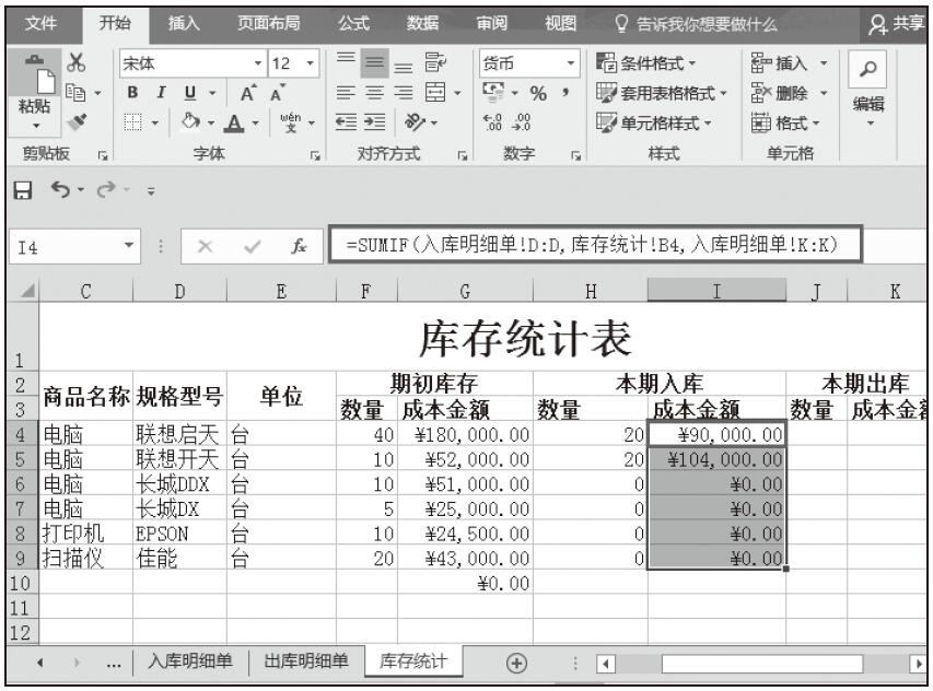 步骤08:导入本期商品入库的成本金额。在I4单元格中输入公式“=SUMIF(入库明细单!D:D,库存统计!B4,入库明细单!K:K)”,按Enter键完成输入,随即返回计算结果。然后将该单元格的公式填充到该列其他单元格中,如图5-99所示。