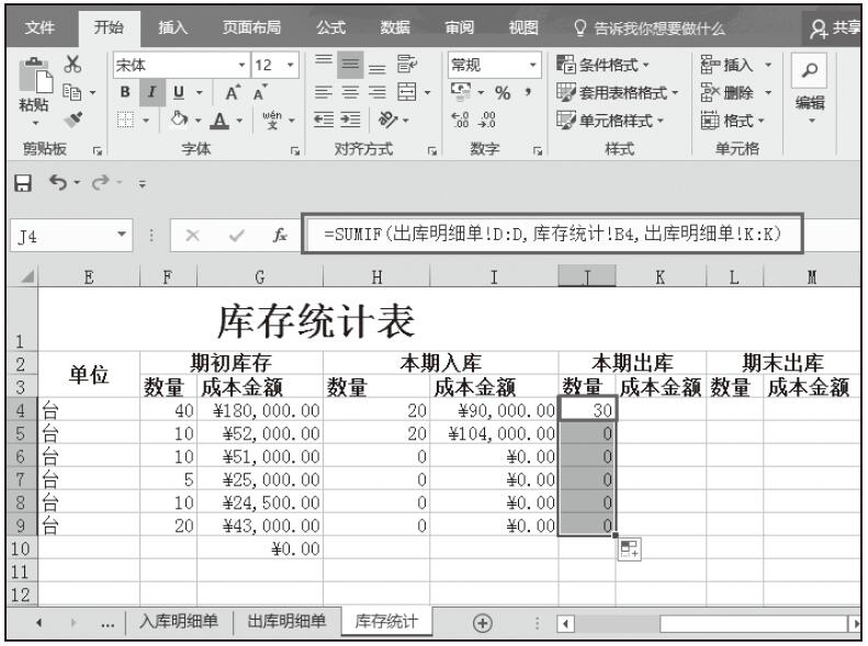 步骤09:导入本期商品出库的数量。在J4单元格中输入公式“=SUMIF(出库明细单!D:D,库存统计!B4,出库明细单!K:K)”,按Enter键完成输入,随即返回计算结果。然后将该单元格的公式填充到该列其他单元格中,如图5-100所示。