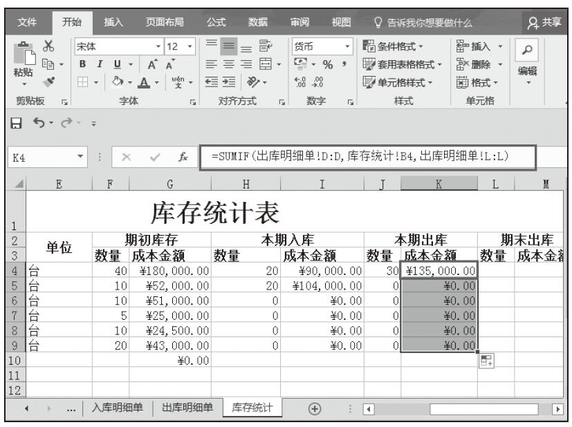 步骤10:导入本期商品出库的成本金额。在K4单元格中输入公式“=SUMIF(出库明细单!D:D,库存统计!B4,出库明细单!L:L)”,按Enter键完成输入,随即返回计算结果,然后将该单元格的公式填充到该列其他单元格中,如图5-101所示。