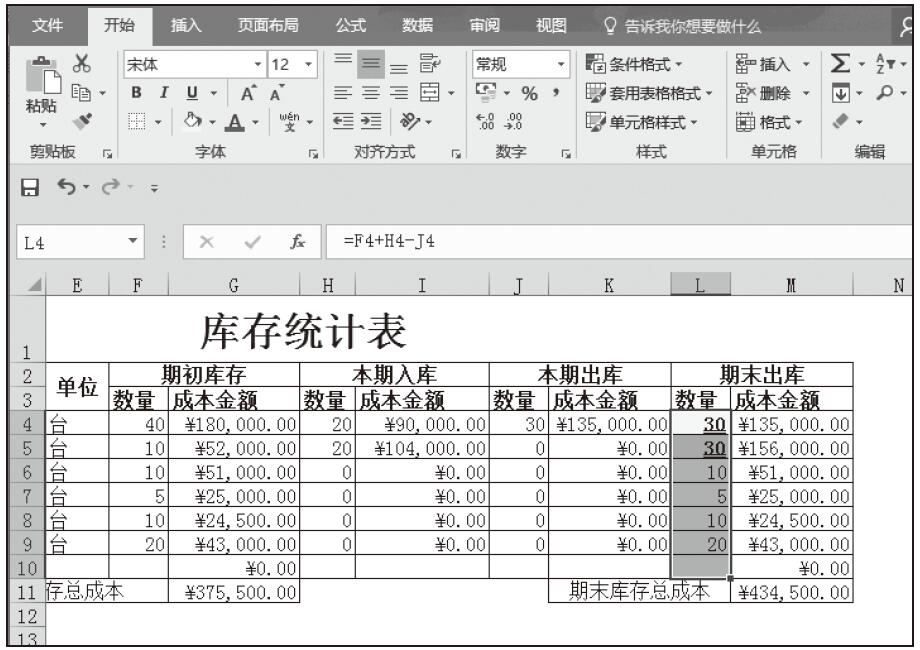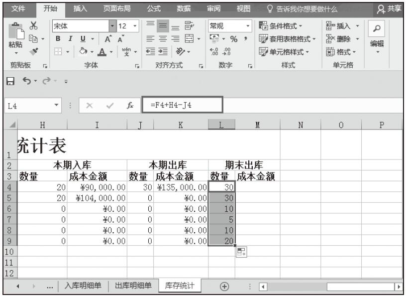 步骤11:计算期末库存的数量。在L4单元格中输入公式“=F4+H4-J4”,按Enter键完成输入,随即返回计算结果。然后将该单元格的公式填充到该列其他单元格中,如图5-102所示。