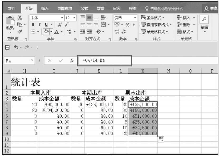 步骤12:计算期末库存的成本金额。在M4单元格中输入公式“=G4+I4-K4”,按Enter键完成输入,随即返回计算结果。然后将该单元格的公式填充到该列其他单元格中,如图5-103所示。