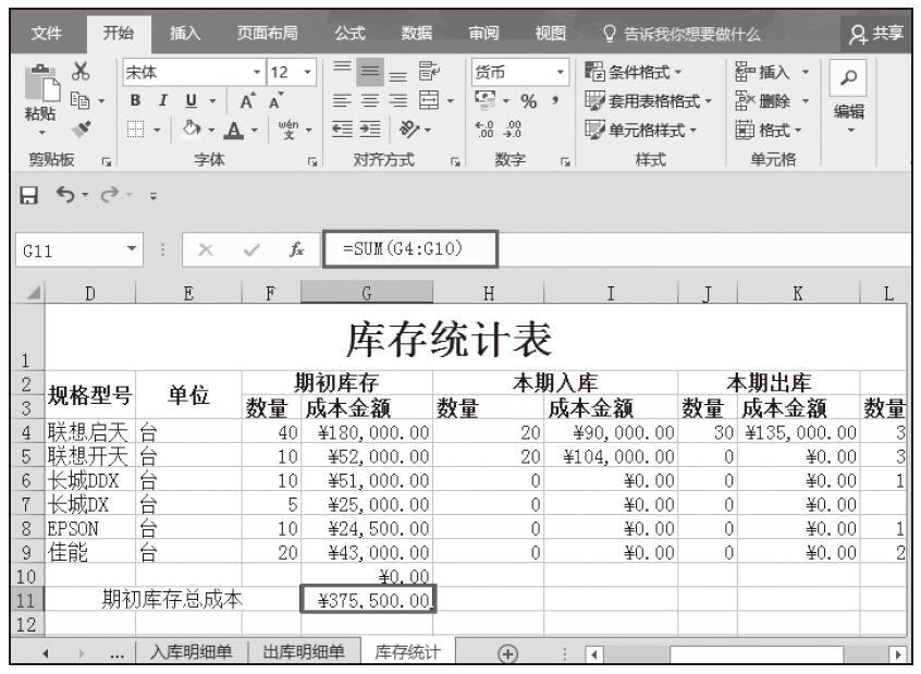 步骤13:计算期初库存总成本。将单元格区域D11:F11合并为1个单元格,输入“期初库存总成本”,然后在G11单元格中输入公式“=SUM(G4:G10)”,按Enter键完成输入,随即返回计算结果,如图5-104所示。