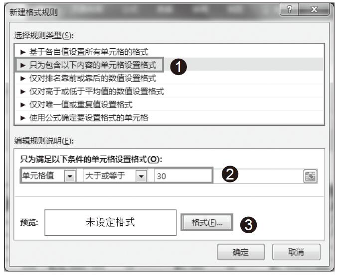步骤02:弹出“新建格式规则”对话框,在“选择规则类型”选项卡下选择“只为包含以下内容的单元格设置格式”规则类型,在“只为满足以下条件的单元格设置格式”条件下,依次选择的条件为“单元格值”“大于或等于”,在右侧的文本框中输入30,然后单击“格式”按钮,如图5-108所示。