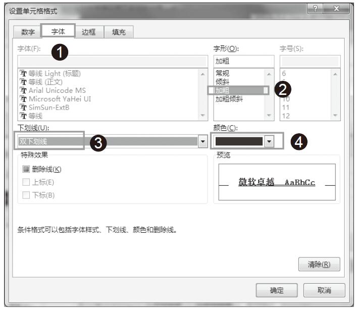 步骤03:打开“设置单元格格式”对话框,切换到“字体”选项卡,将“字形”设置为“加粗”,并且选择添加“双下画线”,选择“颜色”为“深蓝色”,如图5-109所示。